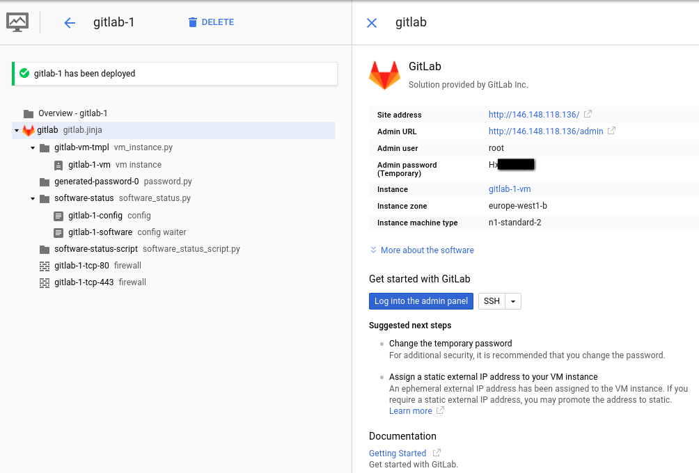 After a few seconds, GitLab will be successfully deployed and you should be able to see the IP address that Google assigned to the VM, as well as the credentials to the GitLab admin account.